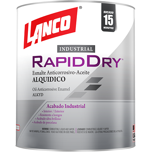 Lanco® Rapid Dry™ 15min. es un esmalte anticorrosivo aceite de resina de alquídica para superficies metálicas que requieran protección anticorrosiva y un secado rápido. Tiene una terminación brillosa y una excelente retención de color. Rapid Dry™ es resistente a la corrosión y a los hongos, en superficies debidamente preparadas, en interiores y exteriores.